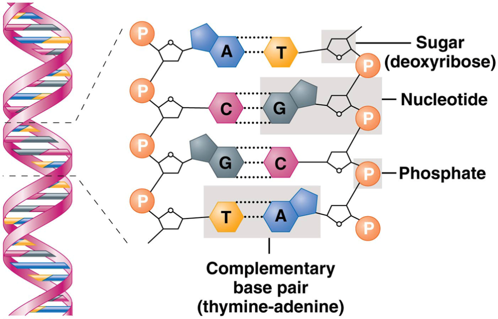 Şekil 1: DNA yapısının özeti, çift sarmalın düzenini (solda) ve her bir ipliği oluşturan kimyasal bileşenleri (sağda) göstermektedir. Sağdaki noktalı çizgiler, DNA sarmalının iki ipliğini bir arada tutan hidrojen bağları adı verilen zayıf kimyasal bağları temsil etmektedir.